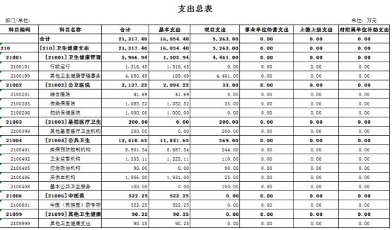 2、支出预算情况。2023年度支出预算21317.40万元,比上年预算增加5401.06万元,增长33.93%。按支出功能分类本年支出预算构成为:卫生健康支出21317.40万元,占本年支出100%。