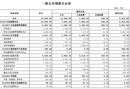 2023年度一般公共预算支出12949.49万元,主要用于以下方面:卫生健康支出(类)12949.49万元,占100%。