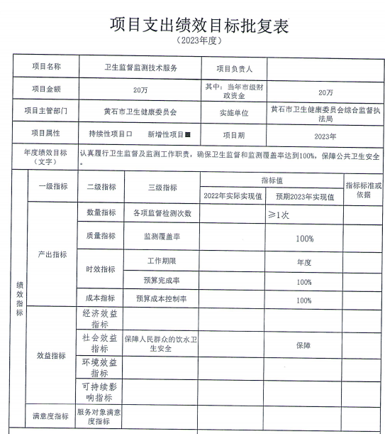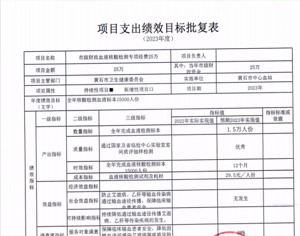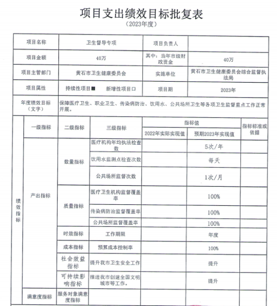 年度绩效目标 (文字) | 一、慢病: 1全市死因监测粗死亡率超过6‰,人均期望寿命超过77.8岁,重大慢病过早死亡率≤15.9%。2、健全肿瘤登记、心脑血管事件、慢阻肺报告。3、继续开展慢病及其危险因素监测。4、实施全民健康生活方式,组织各县区开展重点卫生宣传日的健康宣传活动。5、进一步推进323攻坚行动。6、高血压糖尿病规范管理率达61%,老年人健康管理率达到60%。 7、协助黄石港区开展慢病示范区建设。 二、传染病:1、完成各类传染病监测,掌握我市病原动态。2、调查各类相关传染病病例,防控各种传染病疫情进一步扩散。3、加强输入性传染病的防控防止本地传播扩散。 三、地方病: 1、居民合格碘盐食用率保持在95%以上,碘盐覆盖率达100%。2、8-10岁学生甲状腺肿大率小于5%。3、改水降氟工程水氟含量达到国家生活饮用水标准。 四、免疫规划:国家免疫规划疫苗接种率≥90%;入托入学新生预防接种证查验率≥95%;疑似预防接种异常反应规范处置率≥90%" | |||||