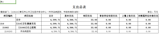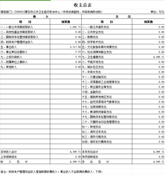 按照综合预算的原则,黄石市结核病防治院所有收入和支出均纳入部门预算管理。收入包括:一般公共预算拨款收入、事业收入;支出包括:卫生健康支出;2024年度收支总预算4399.71万元。
