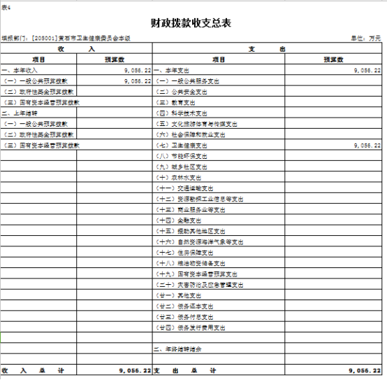 按照综合预算的原则,市卫健委机关所有收入和支出均纳入部门预算管理。收入包括:一般公共预算拨款收入;支出包括:卫生健康支出;2024年度收支总预算9056.22万元。