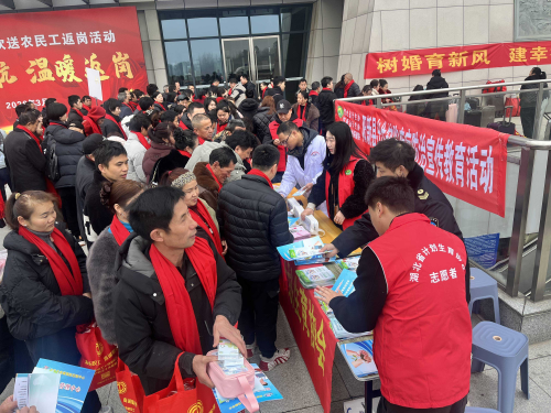 3月5日,阳新县总工会在火车站广场举行欢送农民工返岗活动。阳新县计划生育协会、县卫生健康局、县妇幼保健院(湖北省优生优育指导中心阳新县项目点)联合开展优生优育宣传服务,把政策宣传、健康关怀送到返岗群众身边。