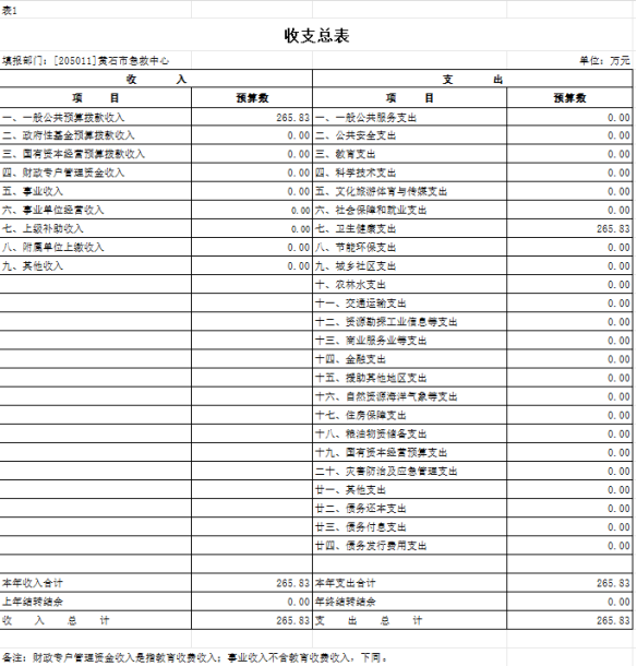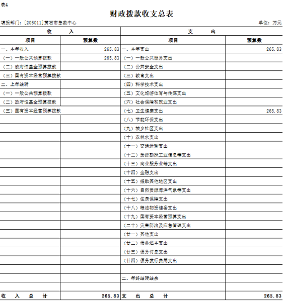 按照综合预算的原则,黄石市急救中心所有收入和支出均纳入部门预算管理。收入包括:一般公共预算拨款收入;支出包括:卫生健康支出;2026年度收支总预算265.83万元。其中:1、收入预算情况。2026年度收入预算265.83