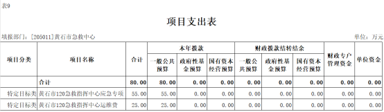 2026年,本单位项目支出全面实施绩效目标管理,项目总预算80万元,2个项目,比上年减少10万元,下降11.11%。根据以前年度绩效评价结果,优化黄石市120急救指挥中心应急专项等项目支出2026年预算安排,并进一步改进管理、完善政策。重点项目预算绩效具体情况: