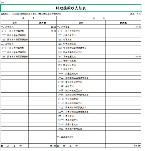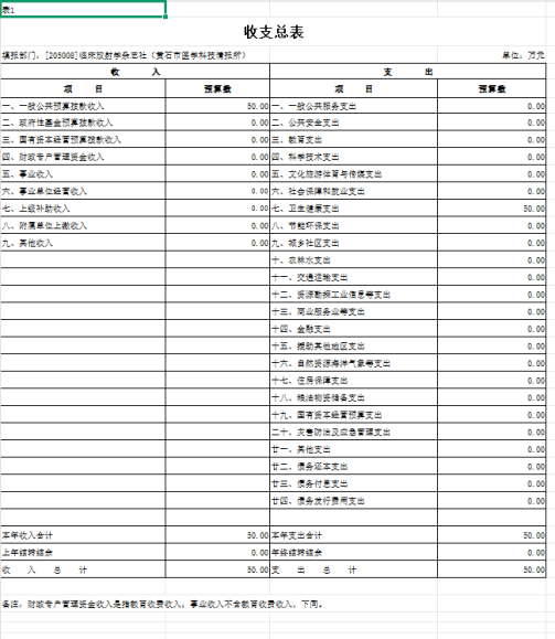 按照综合预算的原则,临床放射学杂志社(黄石市医学科技情报所)所有收入和支出均纳入部门预算管理。收入包括:一般公共预算拨款收入50万元、政府性基金预算拨款收入、国有资本经营预算拨款收入、财政专户管理资金收入、事业收入、事业单位经营收入、上级补助收入、附属单位上缴收入、其他收入;支出包括:一般公共服务支出、公共安全支出、教育支出、科学技术支出、文化旅游体育与传媒支出、社会保障和就业支出、卫生健康支出50万元、节能环保支出、城乡社区支出、农林水支出、交通运输支出、资源勘探工业信息等支出、商业服务业等支出、金融支出、援助其他地区支出、自然资源海洋气象等支出、住房保障支出、粮油物资储备支出、国有资本经营预算支出、灾害防治及应急管理支出、其他支出、债务还本支出、债务付息支出、债务发行费用支出;2026年度收支总预算 50 万元。