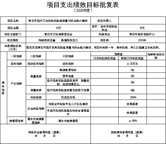 2026年,本部门项目支出全面实施绩效目标管理,项目总预算 10 万元, 1 个项目,比上年增长 0 万元,增长 0 %。根据以前年度绩效评价结果,优化黄石市医疗卫生机构实验室质量与安全能力建设项目支出2026年预算安排,并进一步改进管理、完善政策。重点项目预算绩效具体情况:
