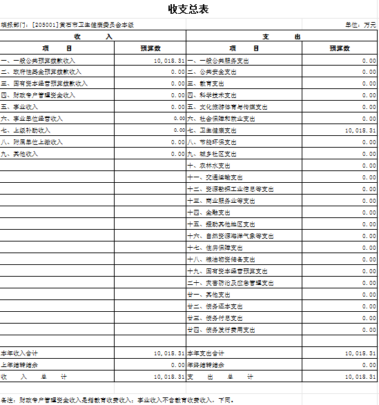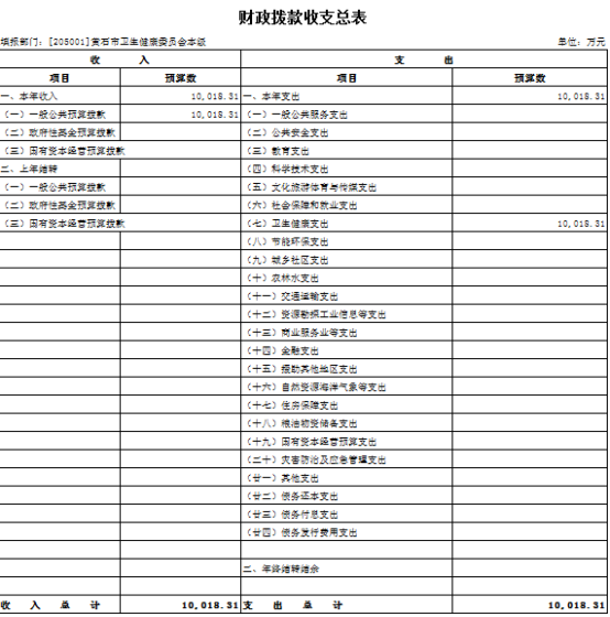 按照综合预算的原则,黄石市卫生健康委员会本级所有收入和支出均纳入部门预算管理。收入包括:一般公共预算拨款收入;支出包括:卫生健康支出;2026年度收支总预算10018.31万元。其中: