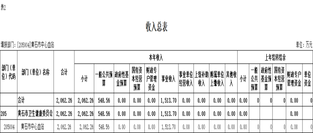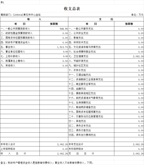按照综合预算的原则,黄石市中心血站所有收入和支出均纳入部门预算管理。收入包括:一般公共预算拨款收入、事业收入;支出包括:卫生健康支出;2026年度收支总预算 2062.26万元。