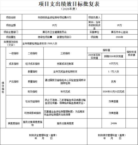 2026年,本部门(单位)项目支出全面实施绩效目标管理,项目总预算25万元,1个项目,与上年对比无增减变化。根据以前年度绩效评价结果,优化市级财政血液检测专项经费等项目支出2026年预算安排,并进一步改进管理、完善政策。重点项目预算绩效具体情况: